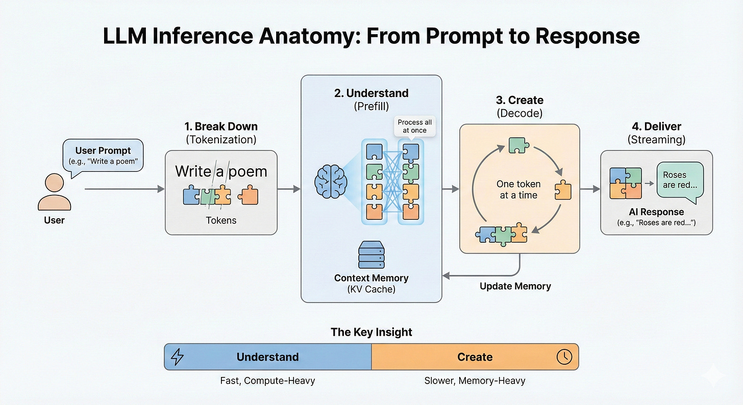 Let’s walk through what actually happens, because understanding this pipeline is the key to understanding why inference costs and performance behave the way they do.