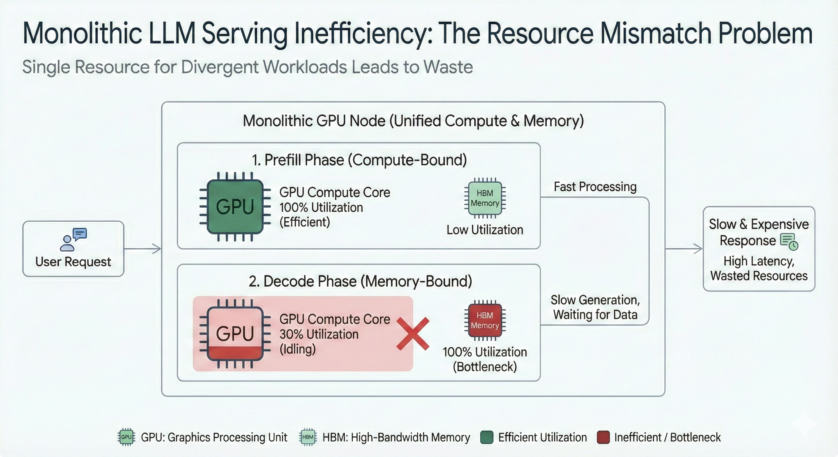 We need to understand why these two phases of LLM inference have unique hardware requirements to better appreciate the architecture that solves the inefficient LLM serving problem.