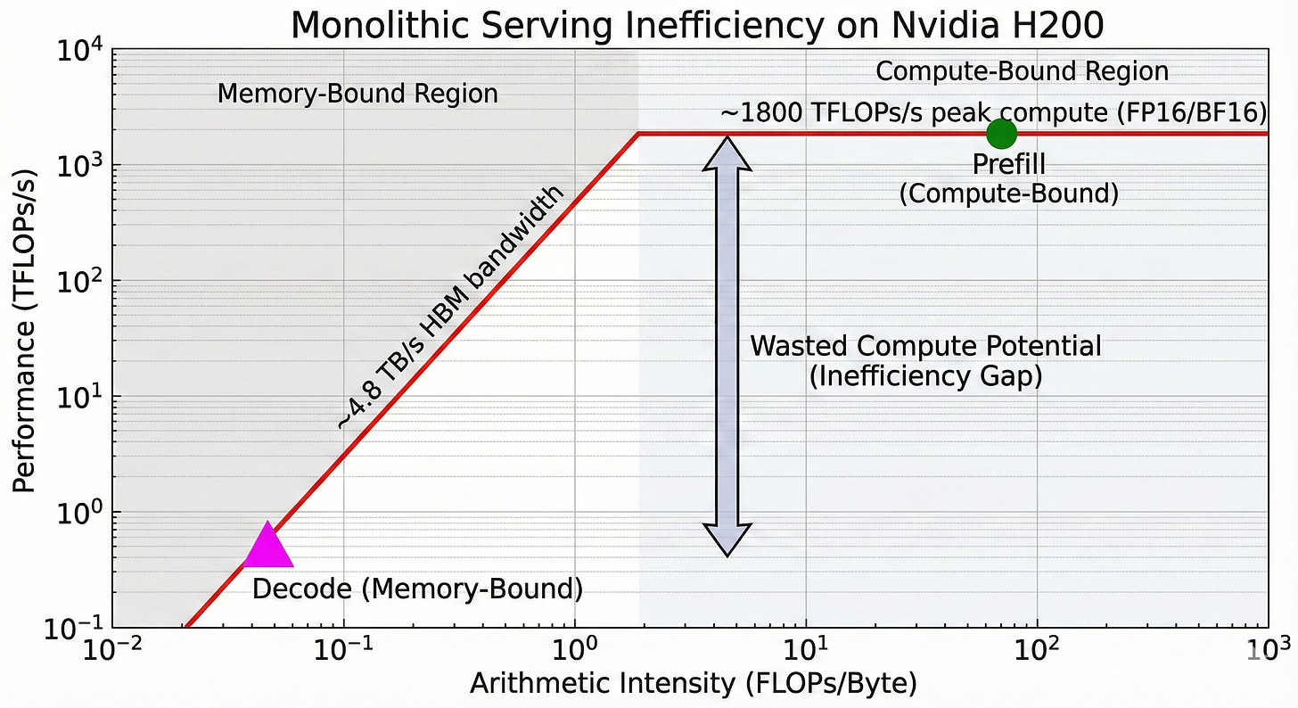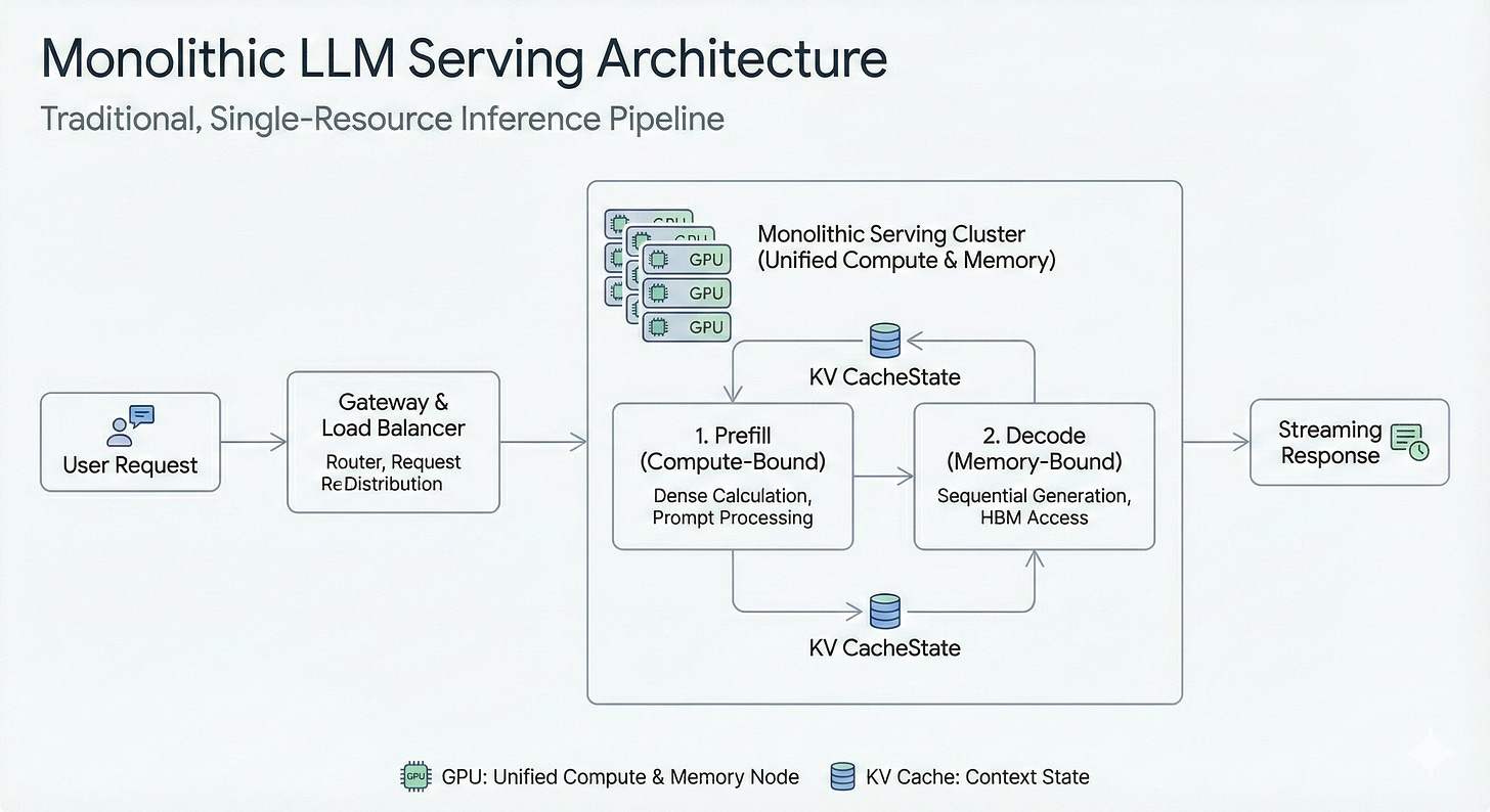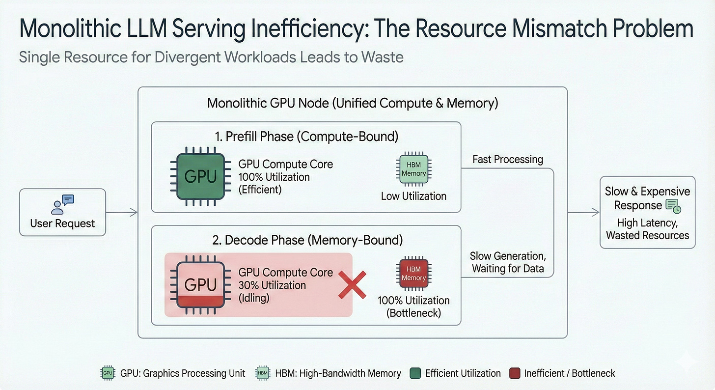 When you smash both phases onto one GPU, you pay for peak compute while the actual job is waiting on data. That dissonance is what makes monolithic model servers disastrously inefficient at scale.