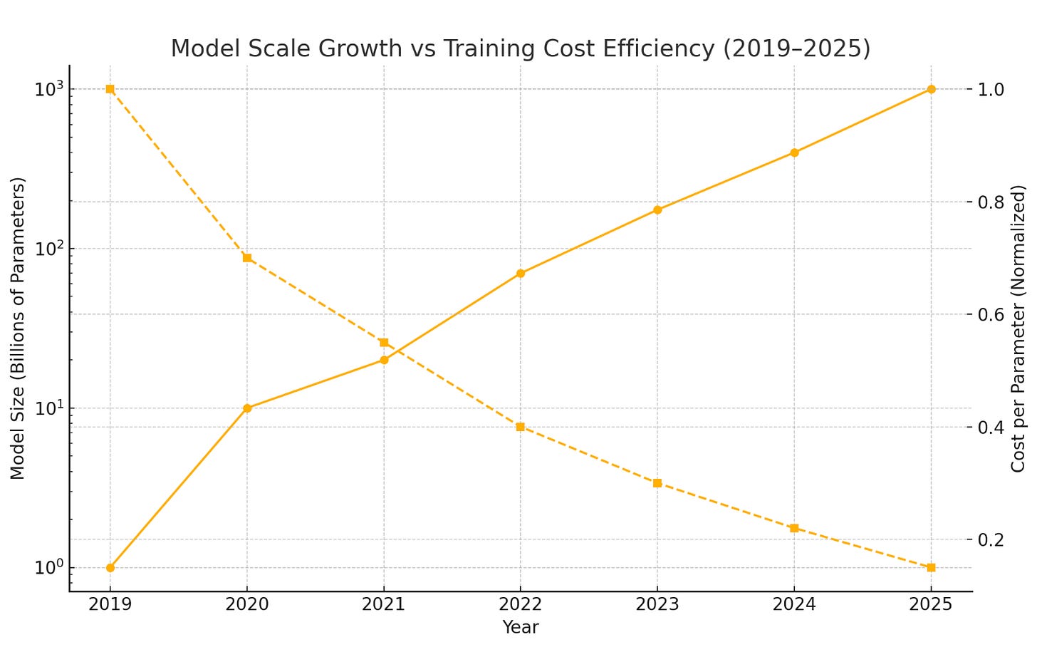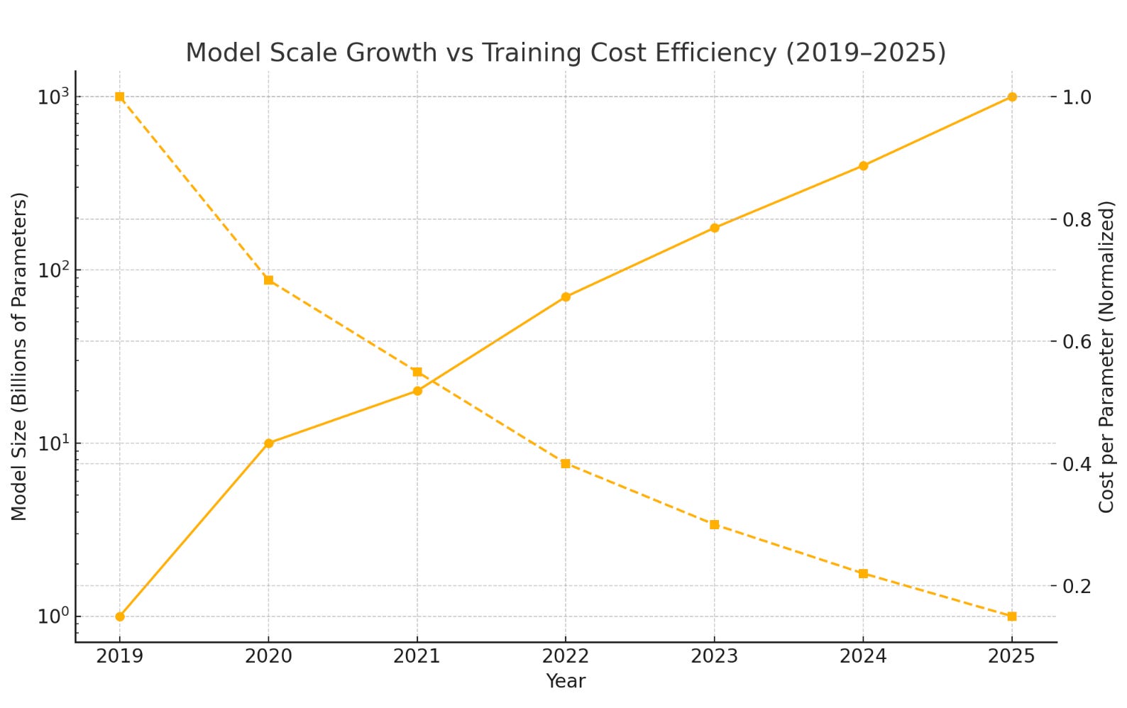 Take a look at the chart below showing model parameter growth vs. training cost efficiency for the period 2019 - 2025.